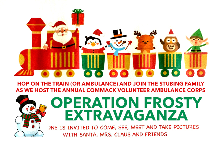 HOP ON THE TRAIN (OR AMBULANCE) AND JOIN THE STUBING FAMILY AS WE HOST THE ANNUAL COMMACK VOLUNTEER AMBULANCE CORPS OPERATION FROSTY EXTRAVAGANZA EVERYONE IS INVITED TO COME, SEE, MEET AND TAKE PICTURES WITH SANTA, MRS. CLAUS AND FRIENDS Date: Saturday December 13th Location: The Stubing Home 10 Olga Lane, Commack Time: Please feel free […] |